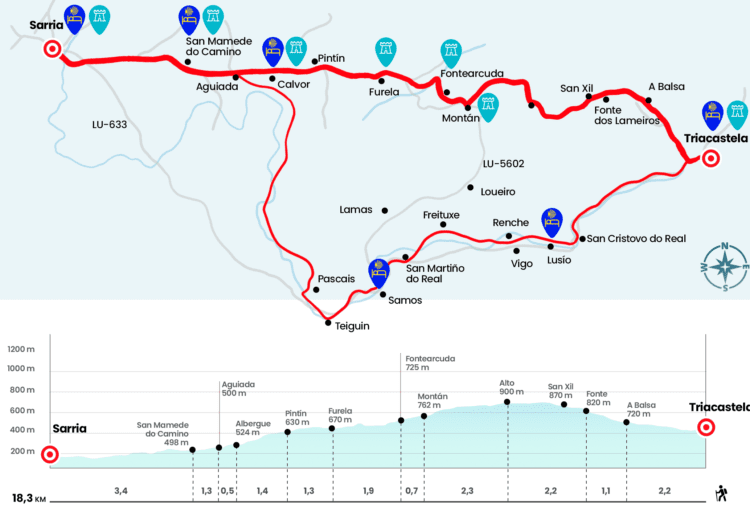La etapa de Triacastela a Sarria en el Camino Francés es una ruta de 18,3 kilómetros con una dificultad media, ofreciendo la opción de seguir por Samos o por San Xil. Este tramo se caracteriza por su belleza natural, pasando por frondosos bosques de robles y castaños, y aldeas pintorescas como Montán y Fontearcuda. Los peregrinos pueden disfrutar de la majestuosidad del monasterio en Samos o de los bosques autóctonos por San Xil, ambos con encantos propios. Sarria, el destino final, es popular entre los peregrinos por ser el punto de partida ideal para obtener la Compostela, al estar a la distancia mínima requerida de Santiago.