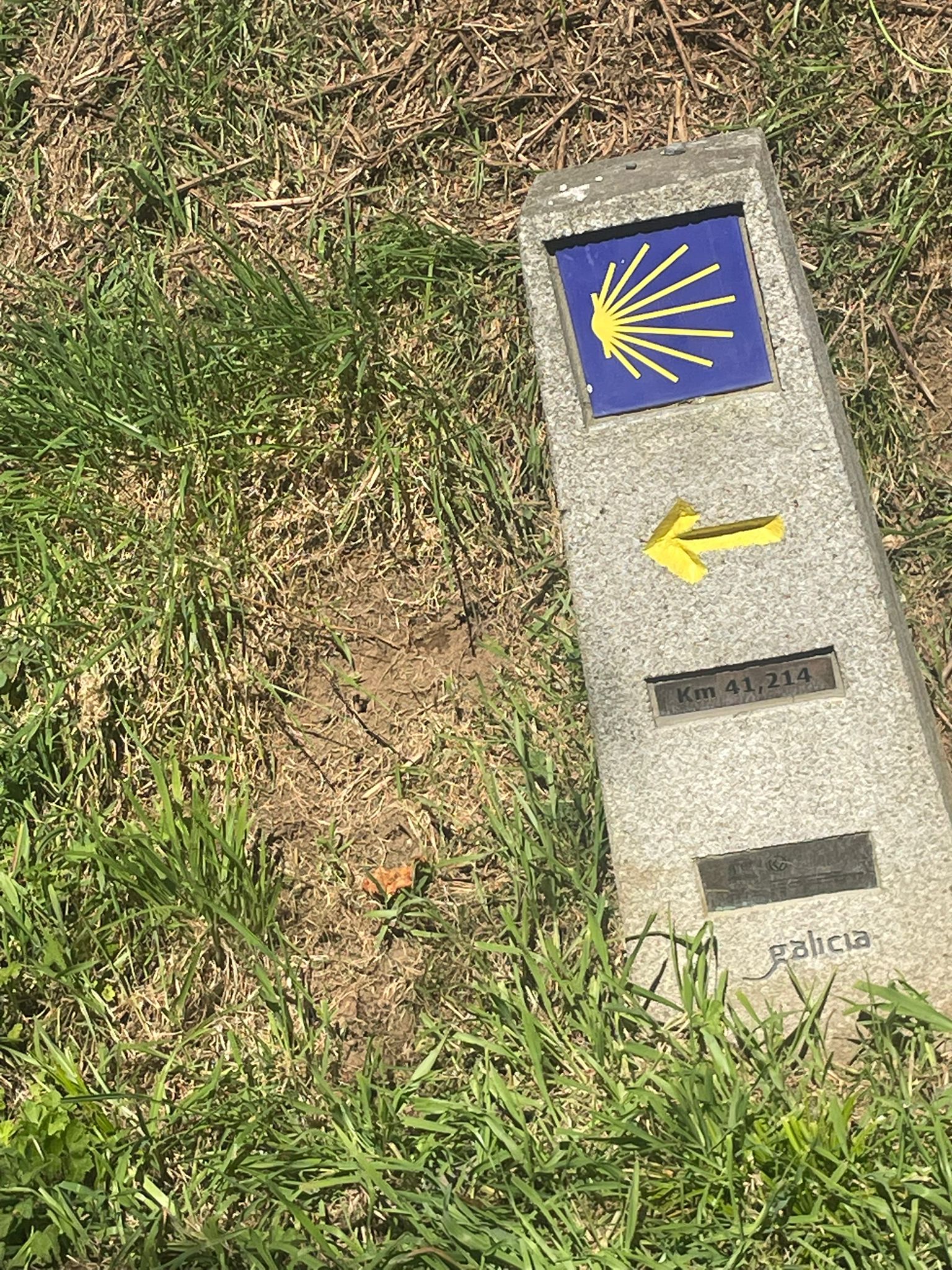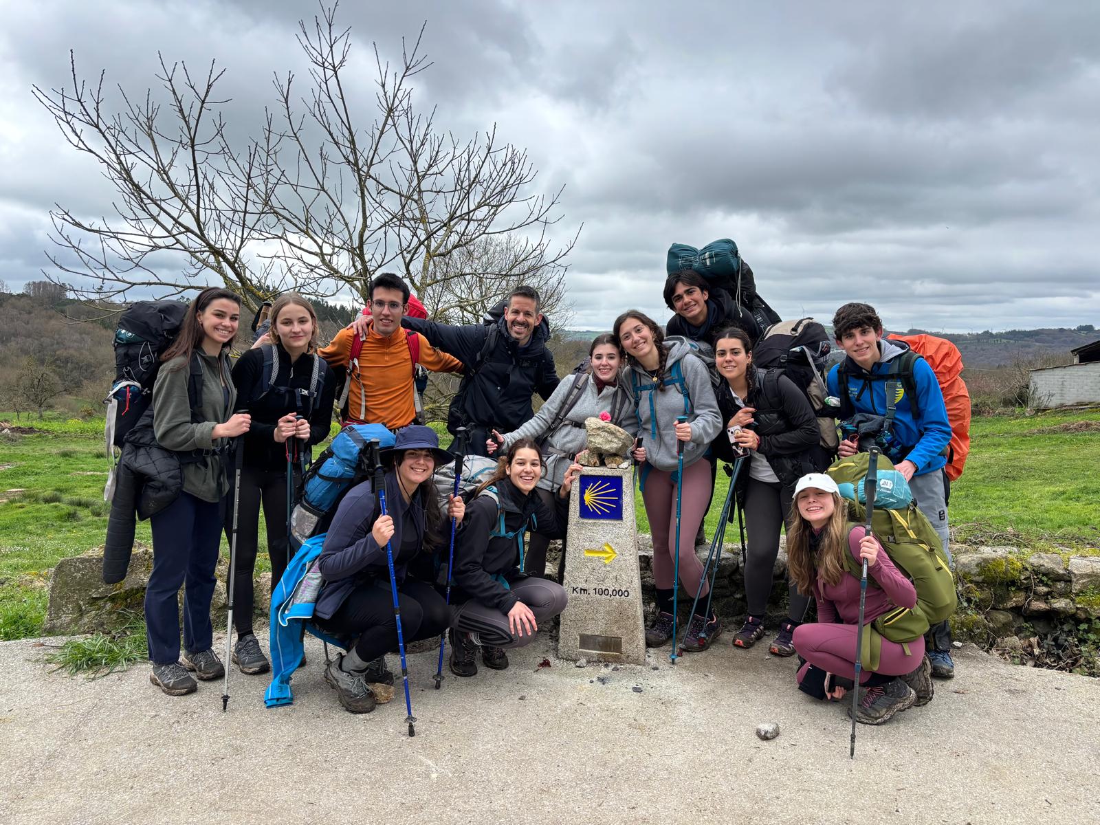 Atravesamos el mojón de los 100 km. Un momento lleno de emoción para todos los peregrinos.