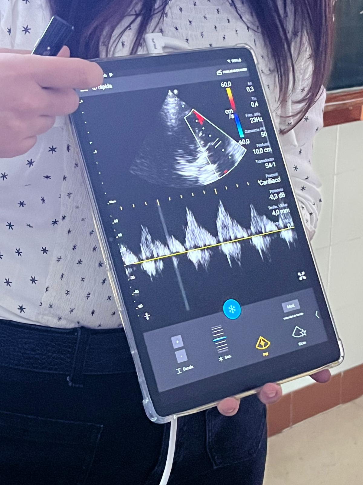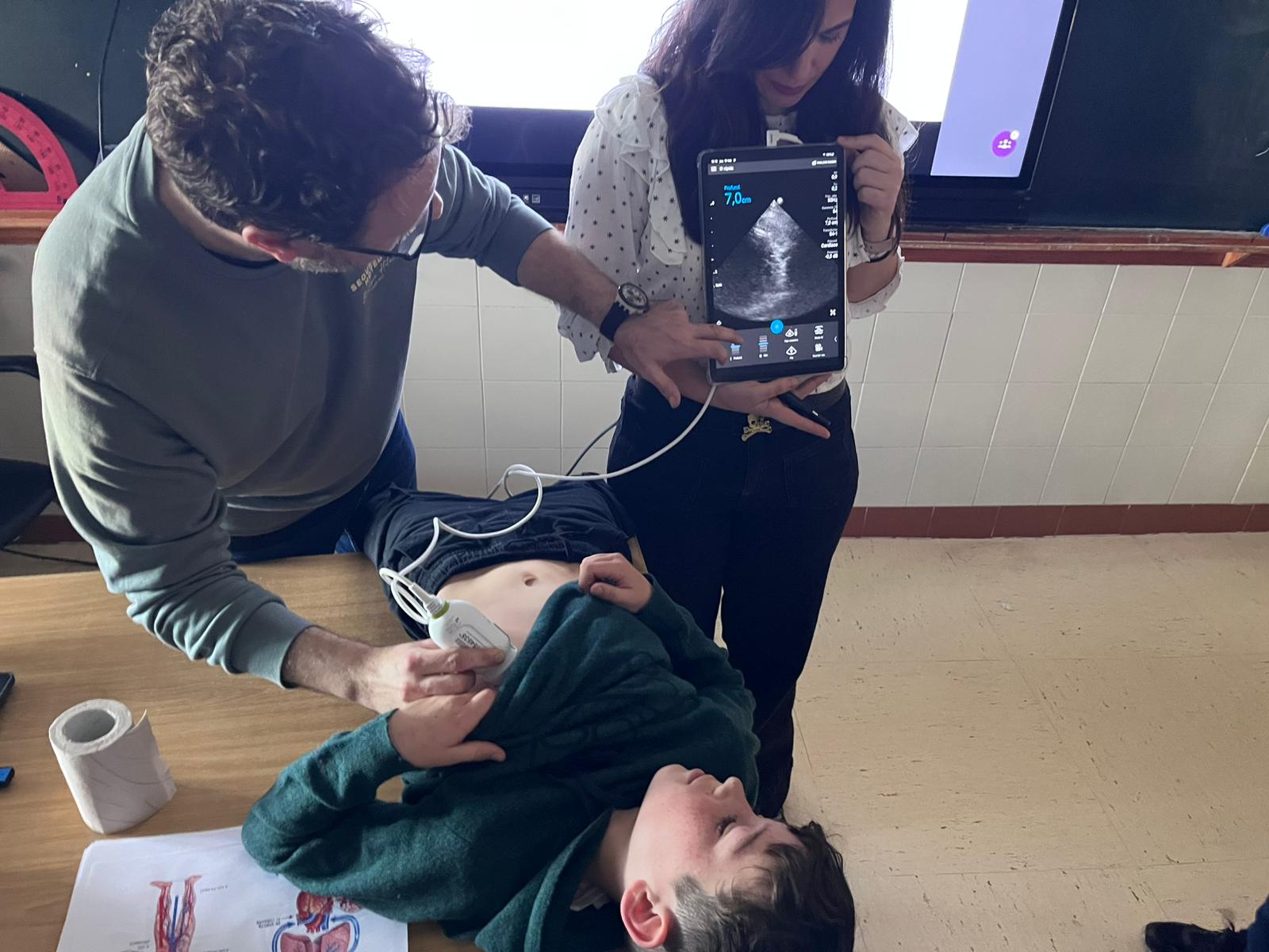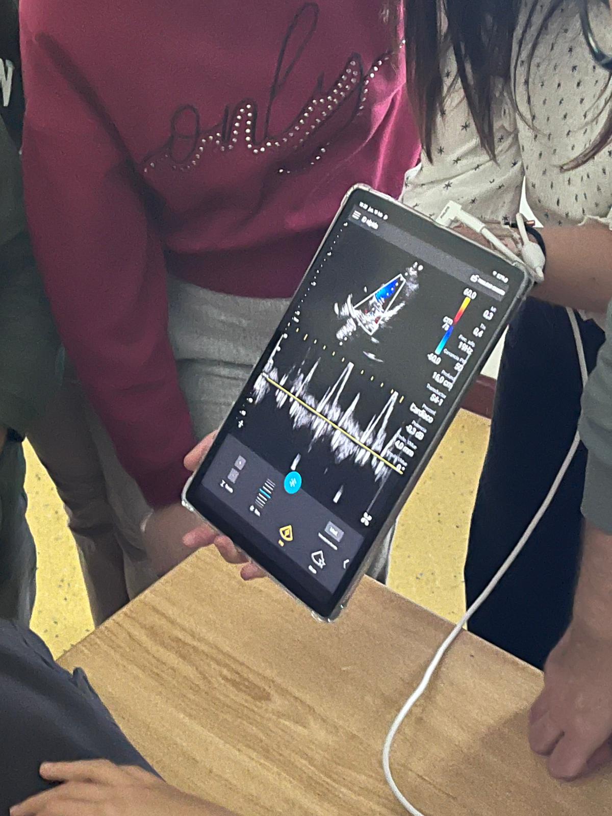 Uno de los momentos más llamativos ha sido la realización de una ecografía cardíaca en directo a algunos alumnos. En la imagen se podía observar el corazón latiendo en tiempo real y medir las pulsaciones. Además, comprobamos cómo, tras realizar un pequeño esfuerzo físico, la frecuencia cardíaca aumentaba, entendiendo así de forma práctica la relación entre actividad y ritmo del corazón.