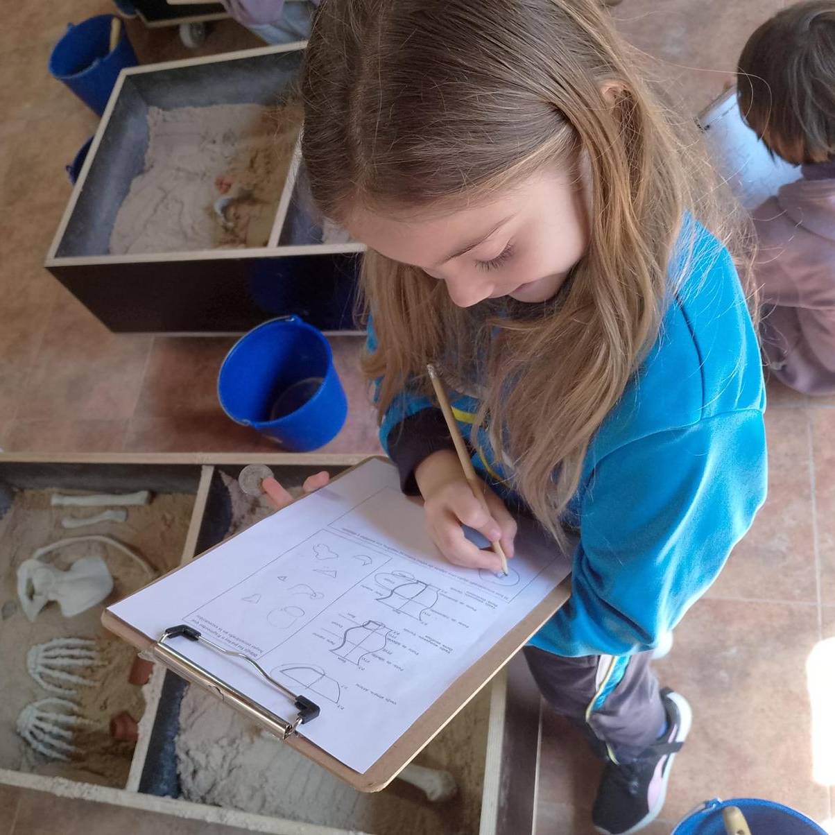 Más tarde nos tocó cambiar de papel y convertirnos en arqueólogos. Excavamos con cuidado, utilizamos herramientas, encontramos piezas y completamos fichas de observación. Fue una forma muy clara y muy práctica de entender que la historia también se investiga con paciencia, atención y buenas preguntas.