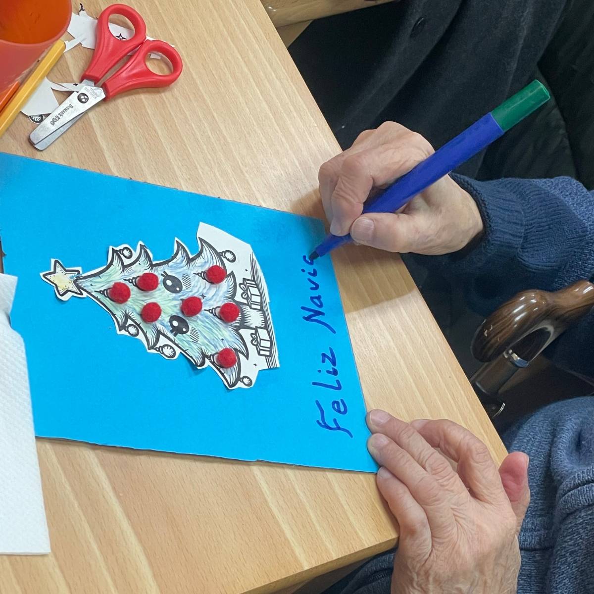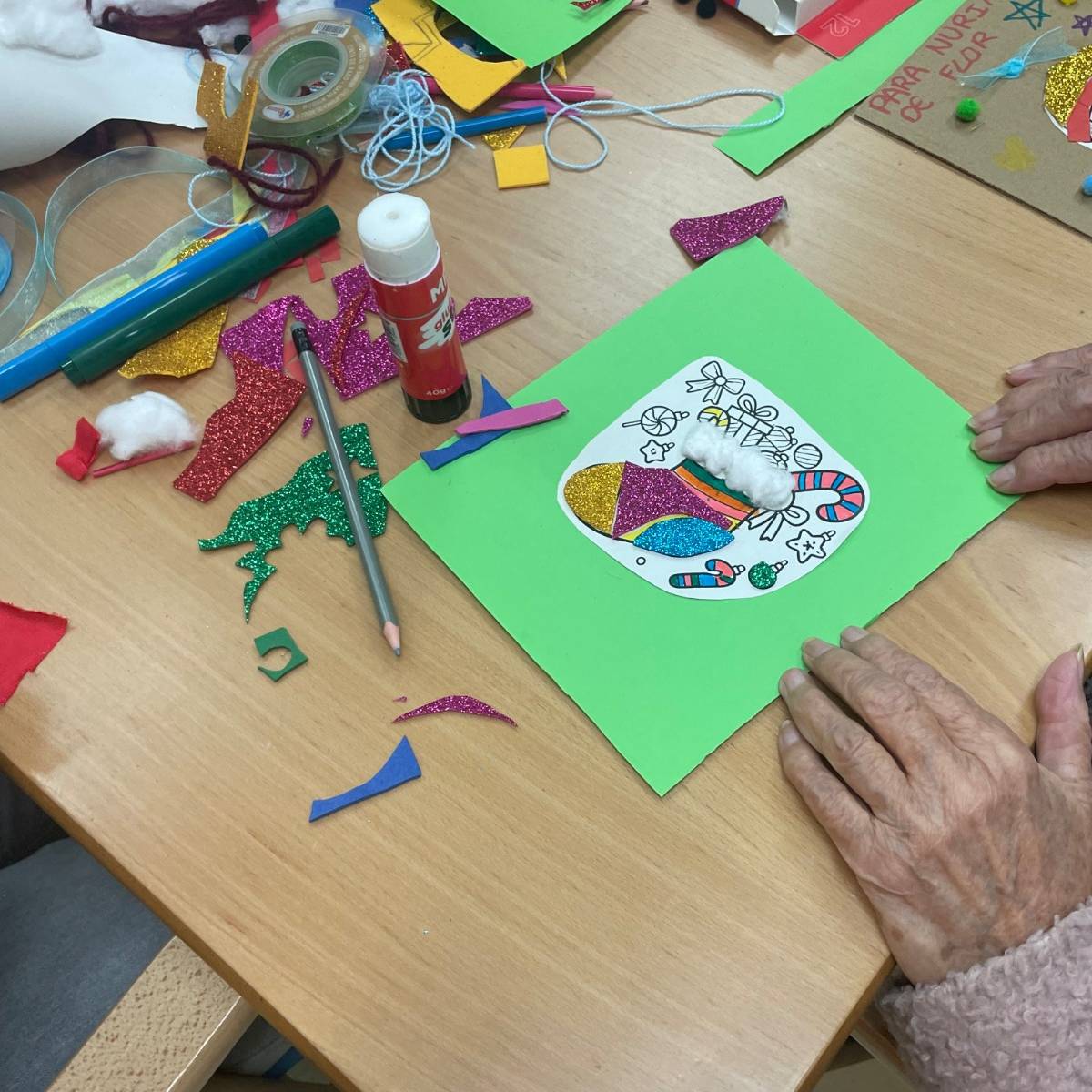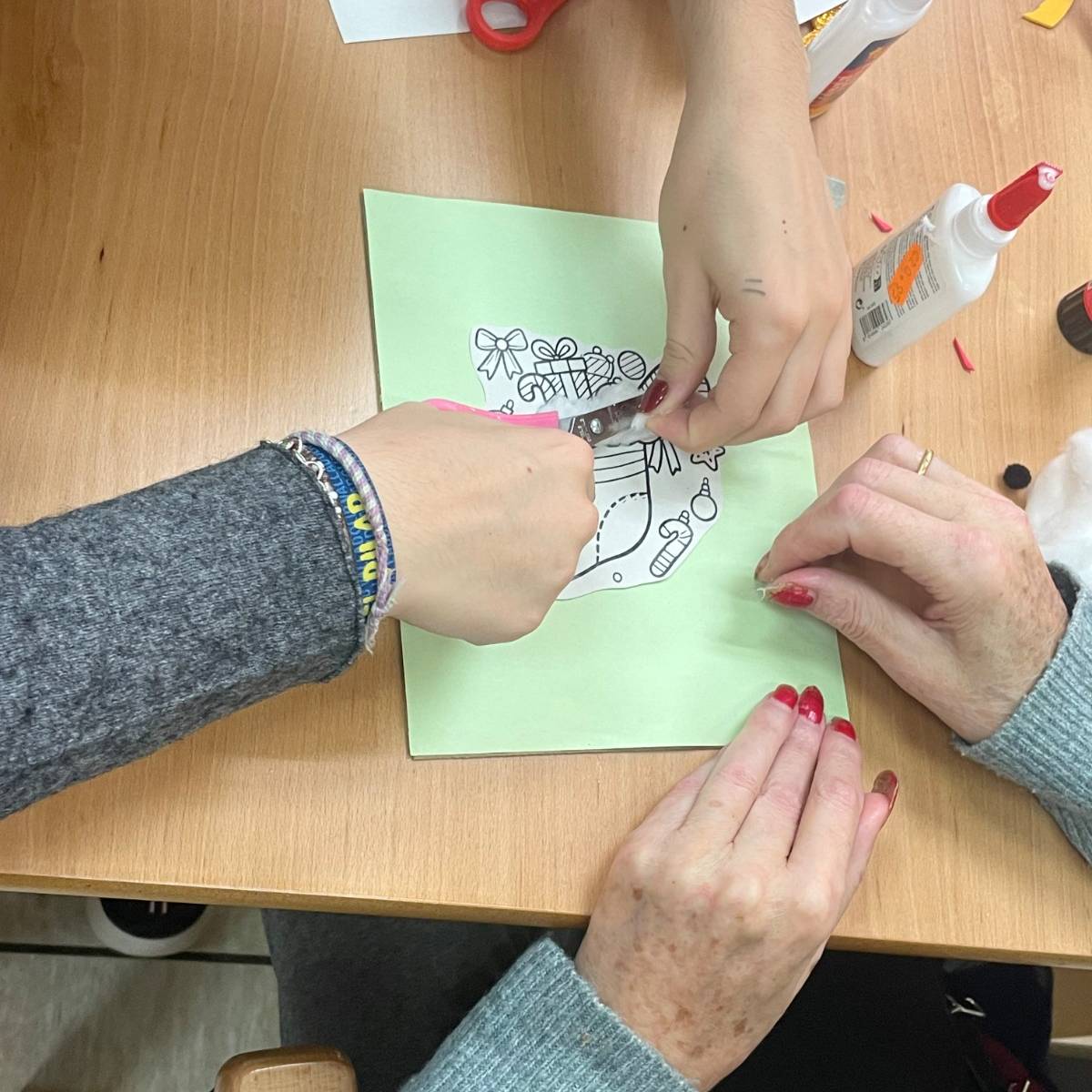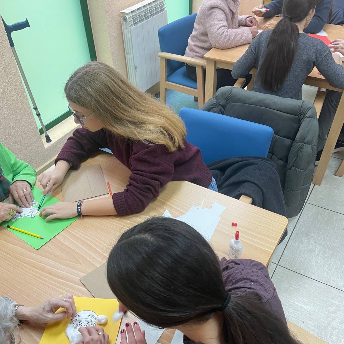 Durante la jornada, trabajaron juntos en la elaboración de postales navideñas, utilizando cartulinas, algodón, pegatinas y otros materiales creativos. En las mesas se mezclaban manos jóvenes y manos con experiencia, colaborando, comentando cada detalle y ayudándose mutuamente en cada paso. Además, no faltaron los villancicos, que comenzaron de forma tímida y terminaron convirtiéndose en un pequeño coro improvisado en el que todos participaron.